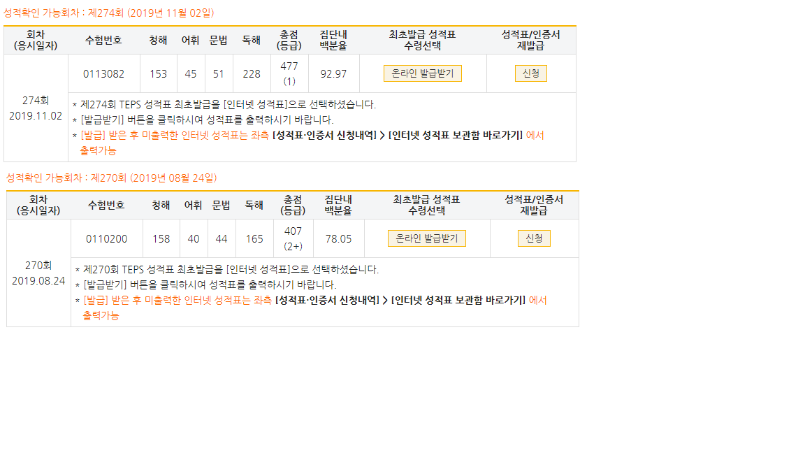 | 총점(600점) | 407점 | 477점 |