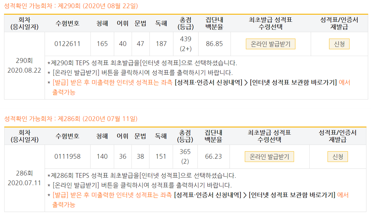 | 총점(600점) | 365점 | 439점 |