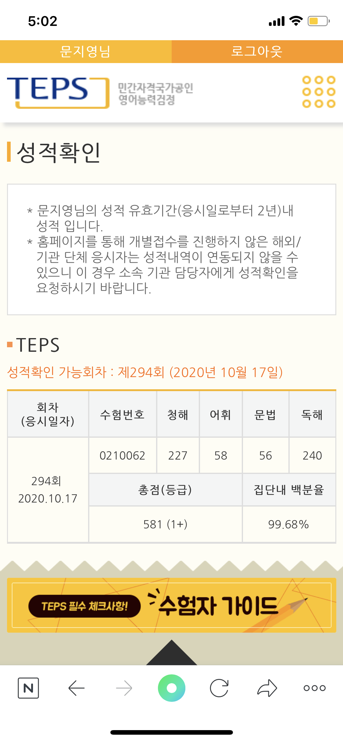| 수강후 | 227점 | 58점 | 56점 | 240점 | 581점 |