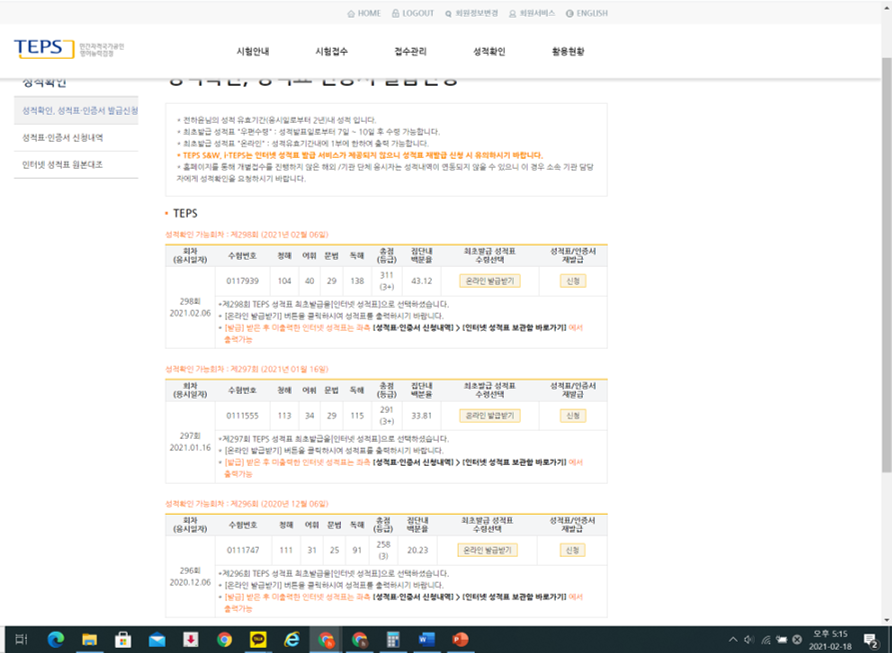 총점(600점) 291 311