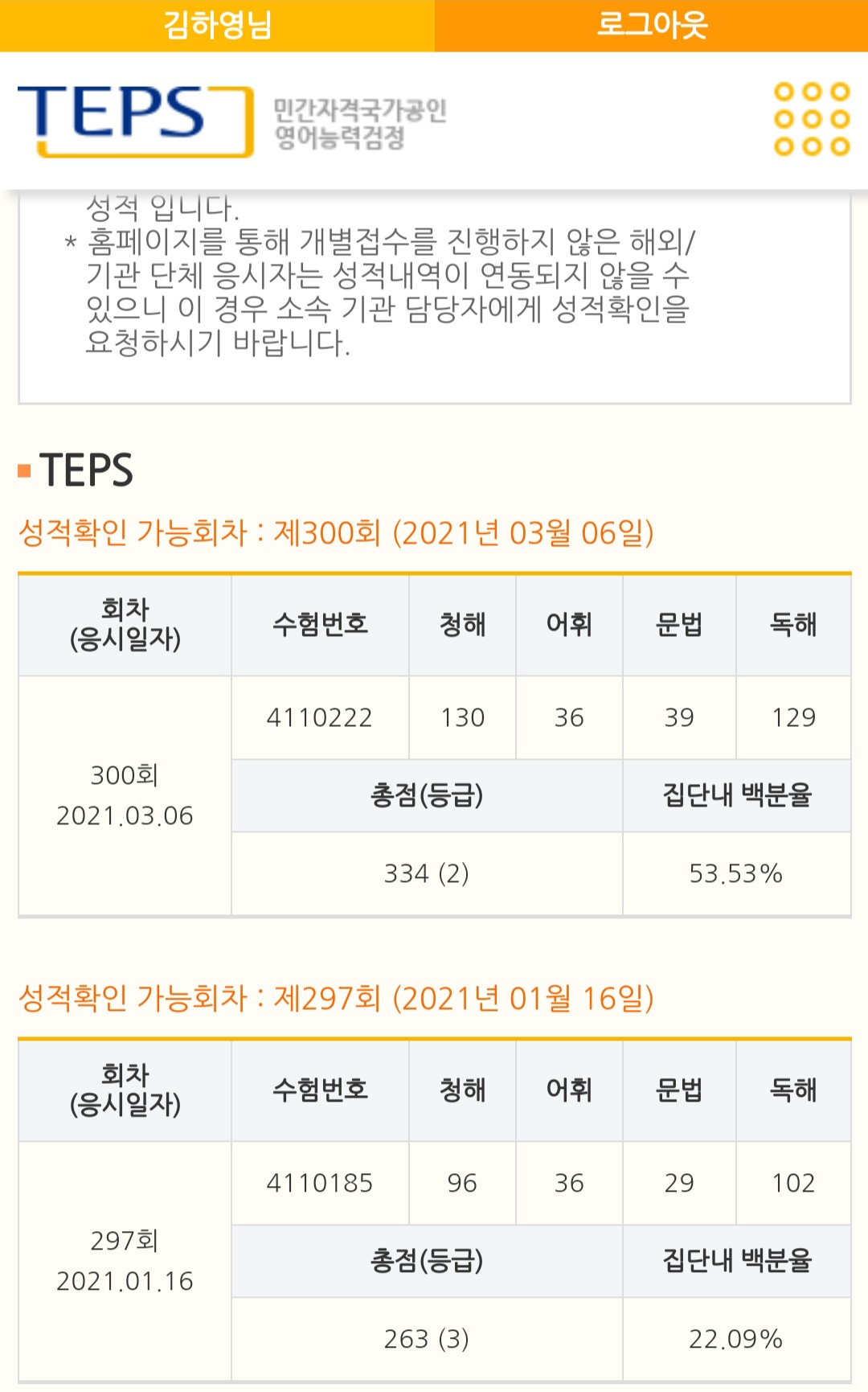 | 총점(600점) | 263점 | 334점 |