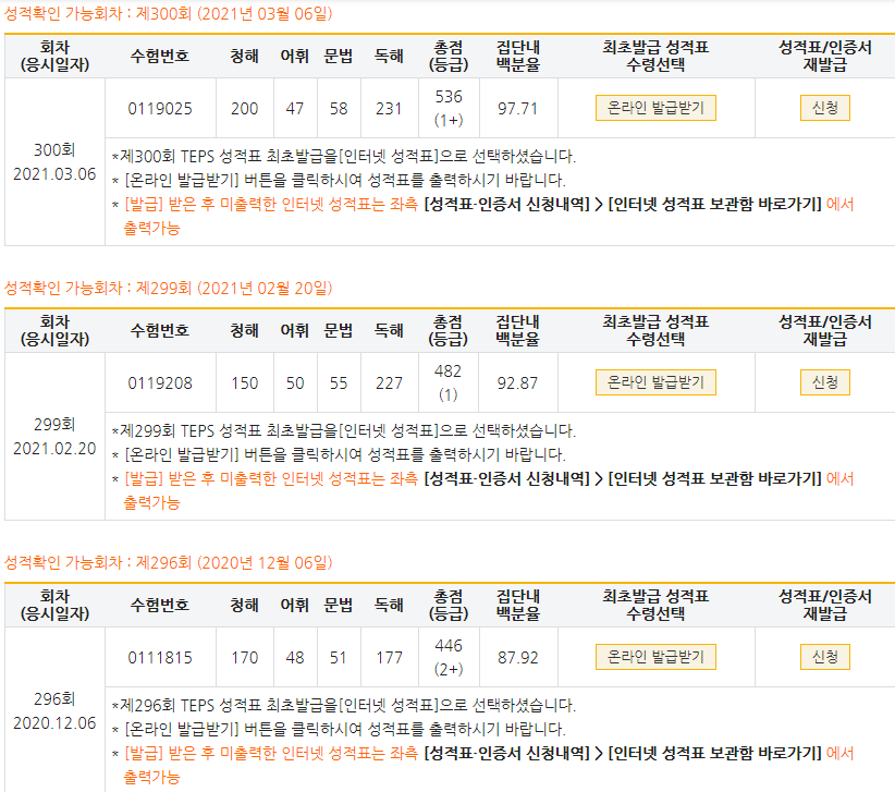 | 총점(600점) | 446점 | 536점 |