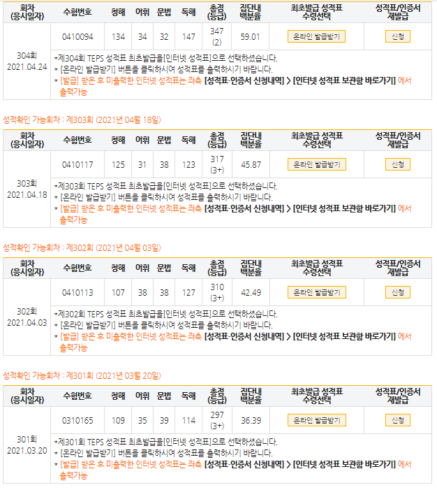 | 청해(240점) | 어휘(60점) | 문법(60점) | 독해(240점) | 총점(600점) | |