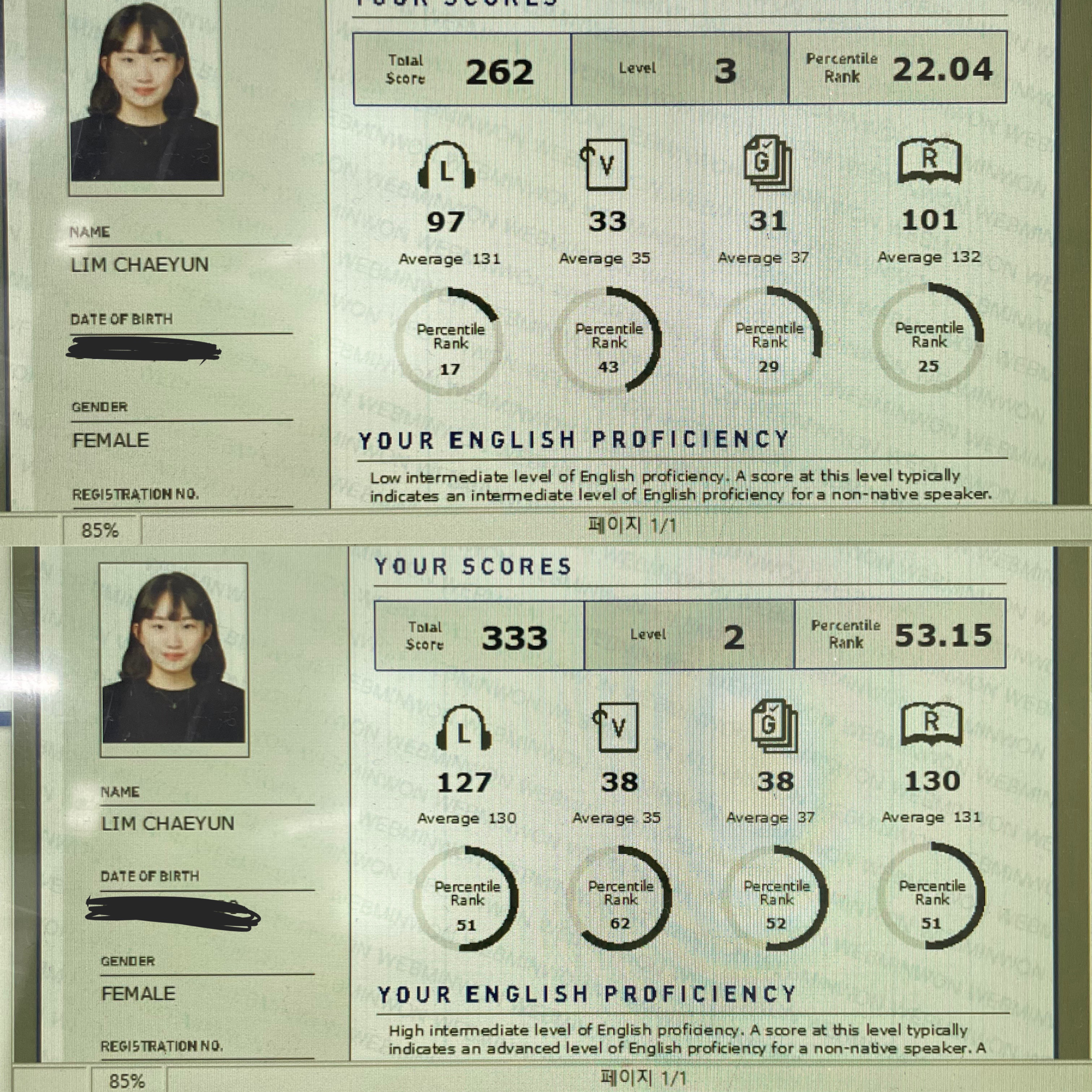 | 수강후 | 127점 | 38점 | 38점 | 130점 | 333점 |