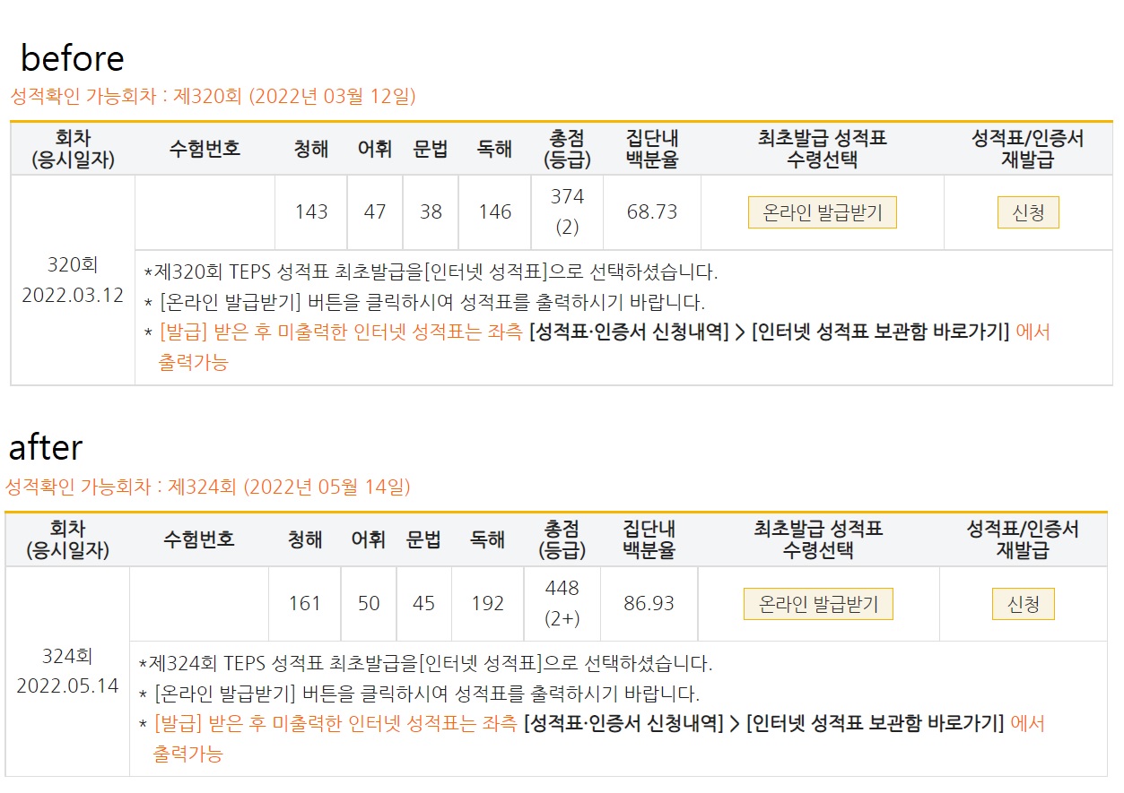 | 수강후 | 161점 | 50점 | 45점 | 192점 | 448점 |