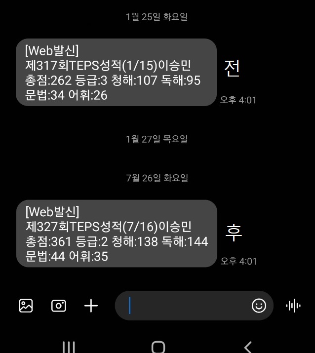 | 수강후 | 138점 | 35점 | 44점 | 144점 | 361점 |