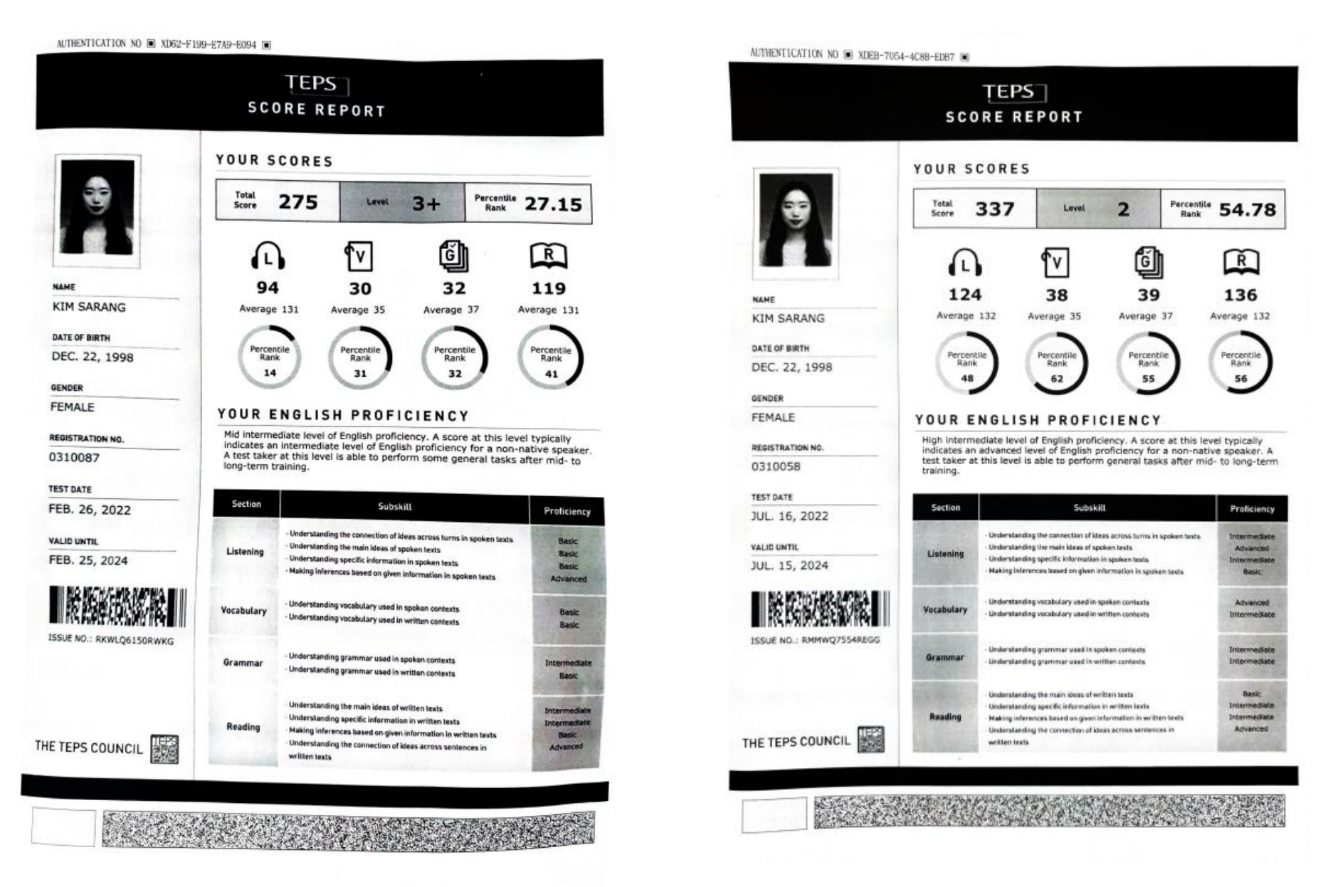 | 수강후 | 124점 | 38점 | 39점 | 136점 | 337점 |