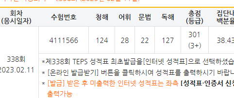 | 총점(600점) | 253점 | 301점 |