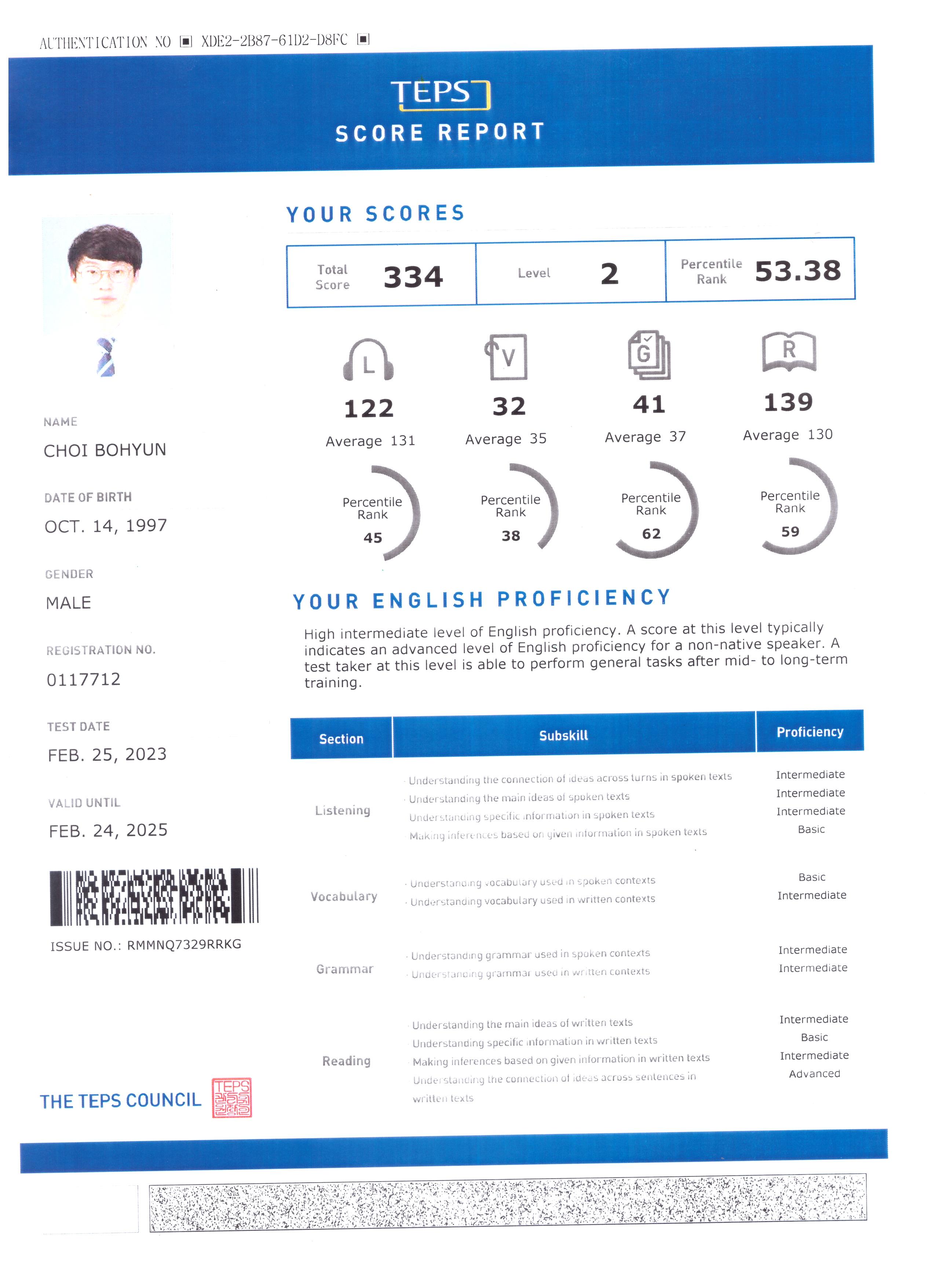 청해(240점) 어휘(60점) 문법(60점) 독해(240점) 총점(600점)