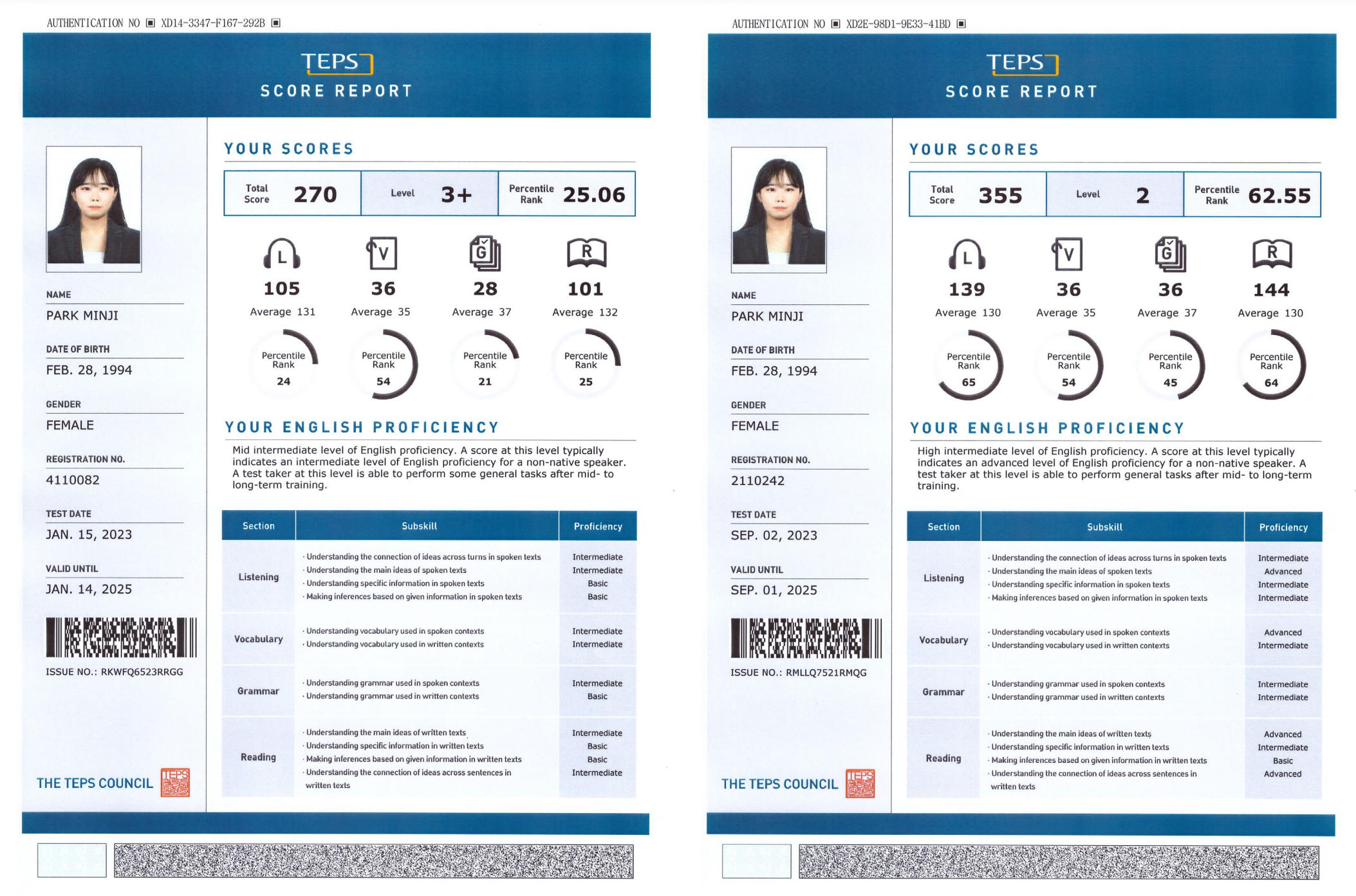 수강후 | 139점 | 36점 | 36점 | 144점 | 355점 |