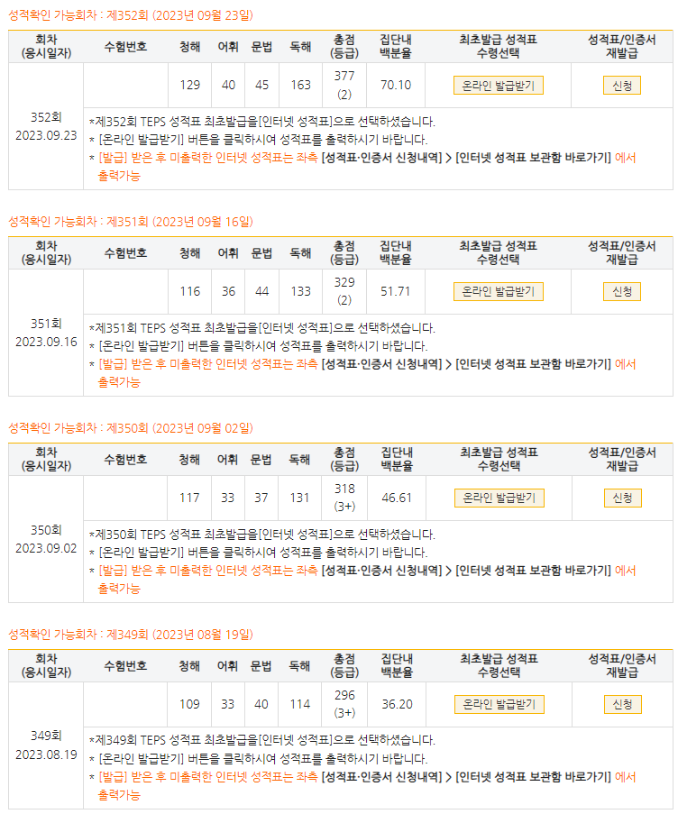 | 청해(240점) | 어휘(60점) | 문법(60점) | 독해(240점) | 총점(600점) | |