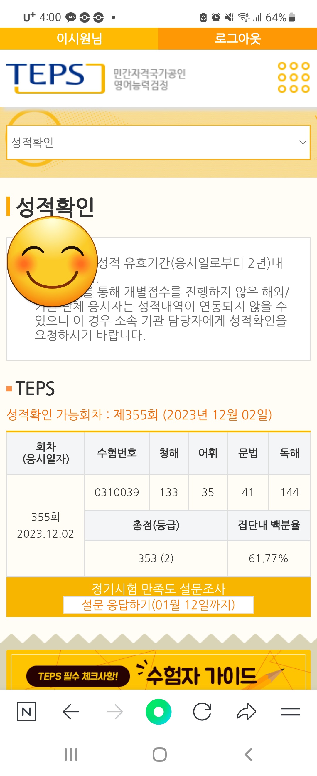 | 수강후 | 133점 | 35점 | 41점 | 144점 | 353점 |