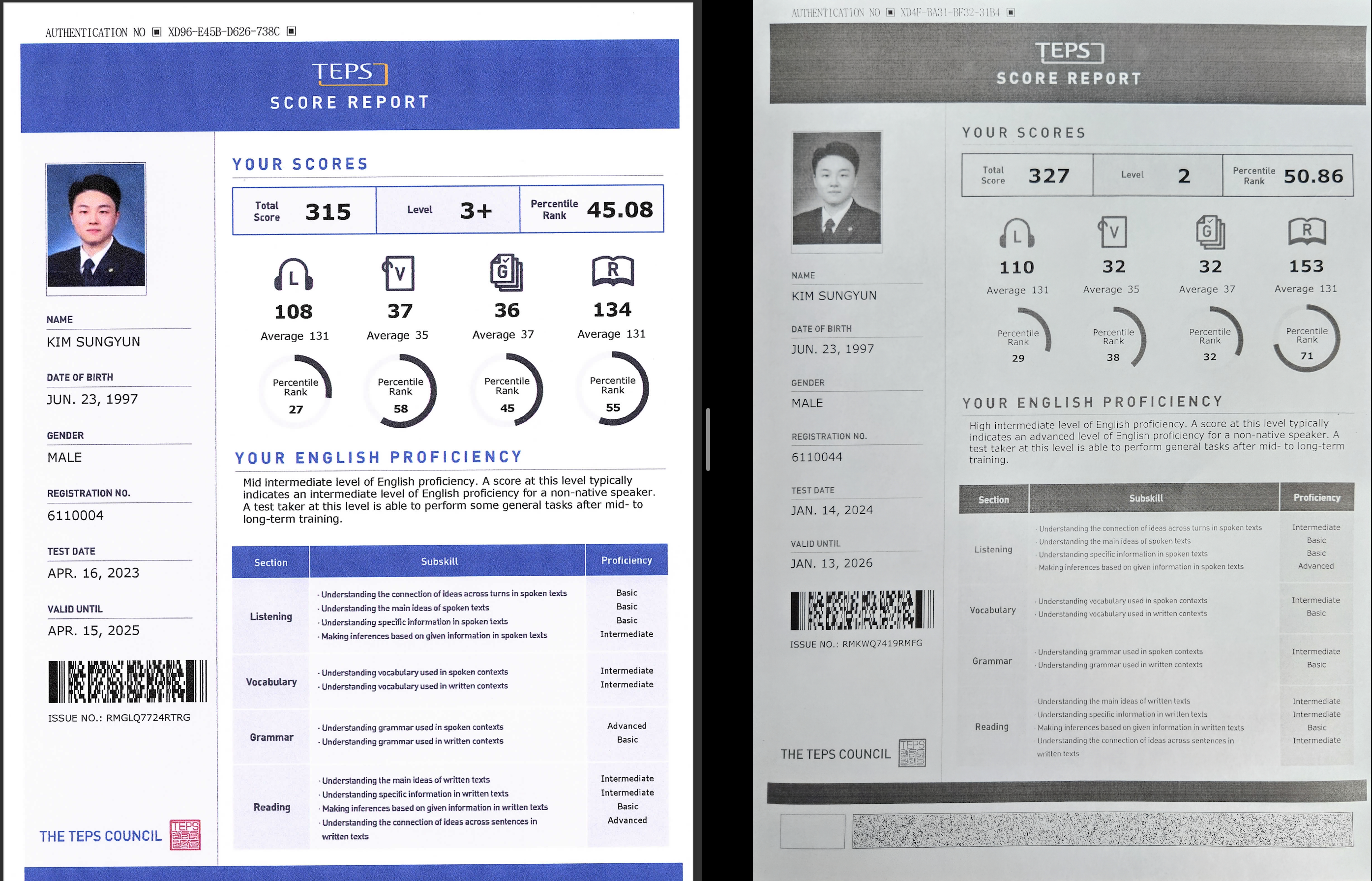 청해(240점) 어휘(60점) 문법(60점) 독해(240점) 총점(600점)