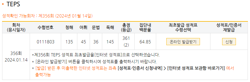 | 수강후 | 135점 | 45점 | 36점 | 145점 | 361점 |