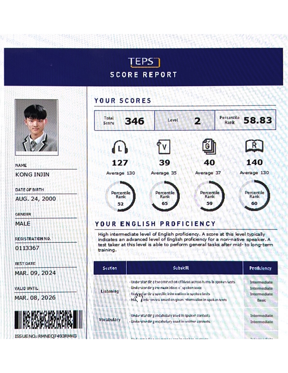 | 수강후 | 127점 | 39점 | 40점 | 140점 | 346점 |