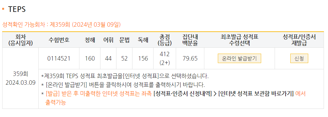 | 총점(600점) | 400점 | 412점 |