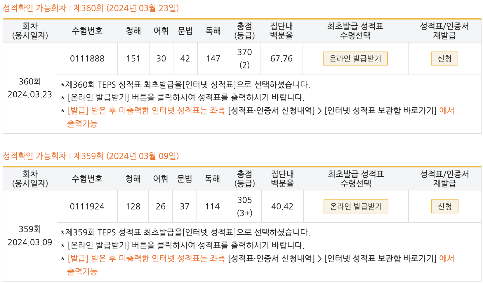 청해(240점) 어휘(60점) 문법(60점) 독해(240점) 총점(600점)