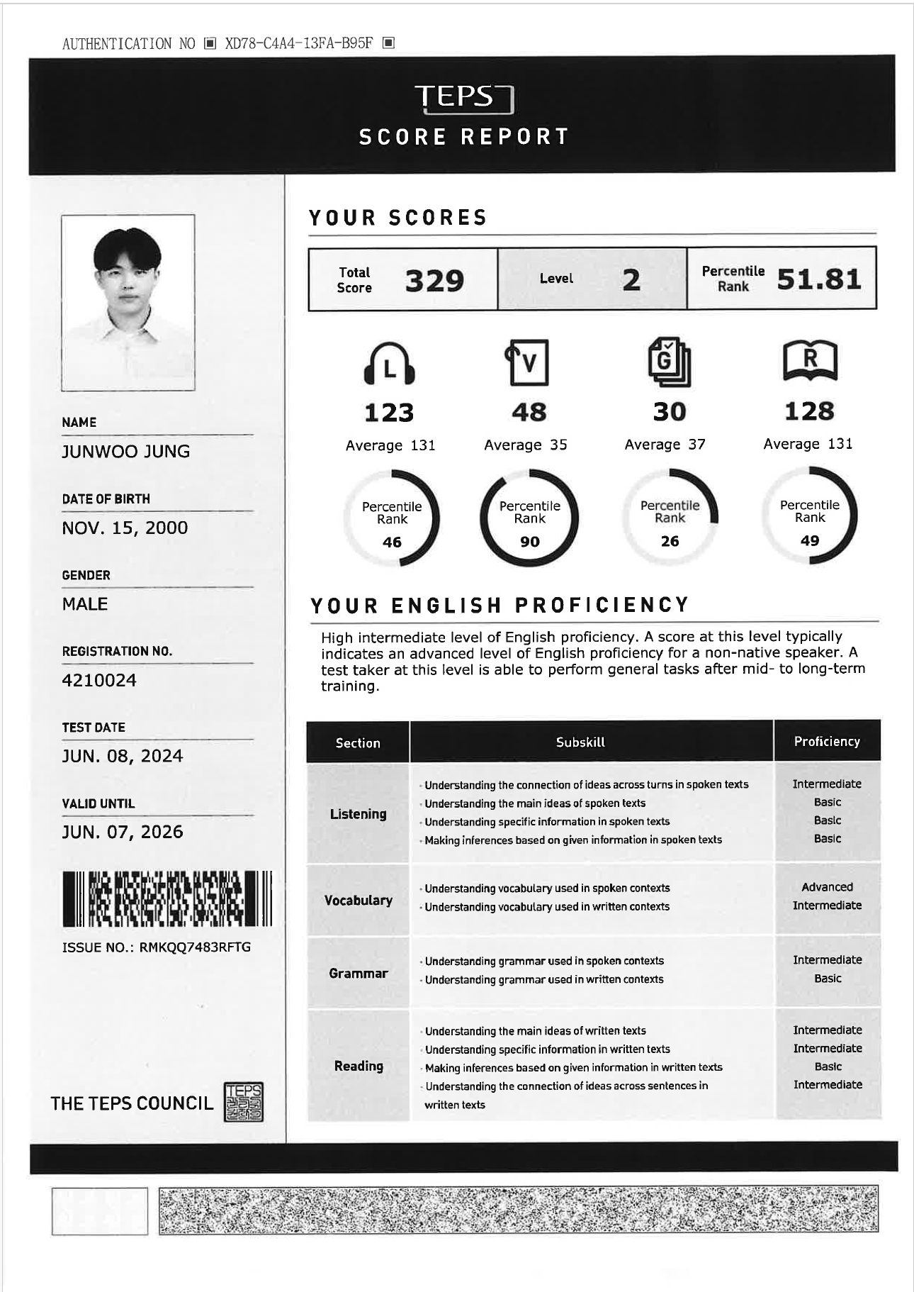 | 수강후 | 123점 | 48점 | 30점 | 128점 | 329점 |