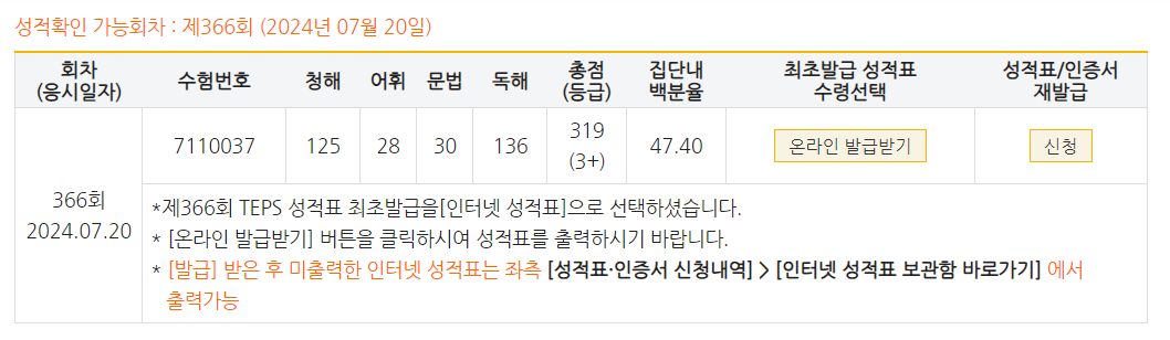 | 총점(600점) | 268점 | 319점 |
