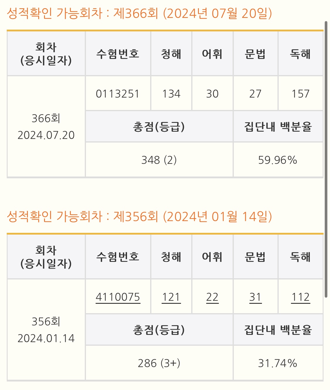 청해(240점) 어휘(60점) 문법(60점) 독해(240점) 총점(600점)