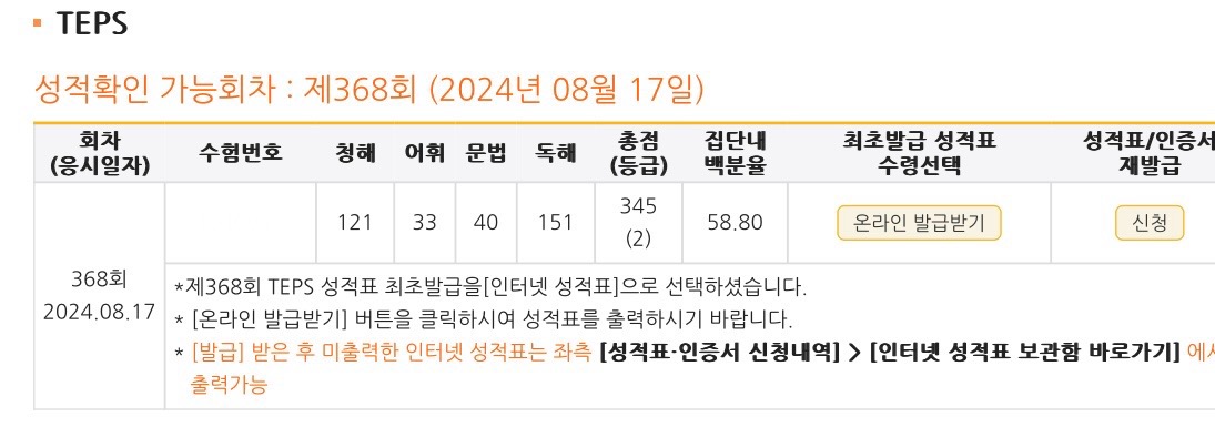 청해(240점) 어휘(60점) 문법(60점) 독해(240점) 총점(600점)