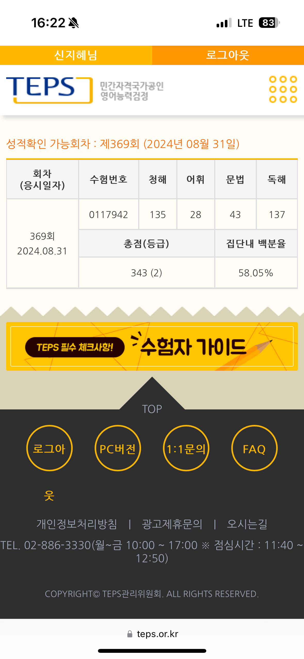 | 수강후 | 135점 | 28점 | 43점 | 137점 | 343점 |