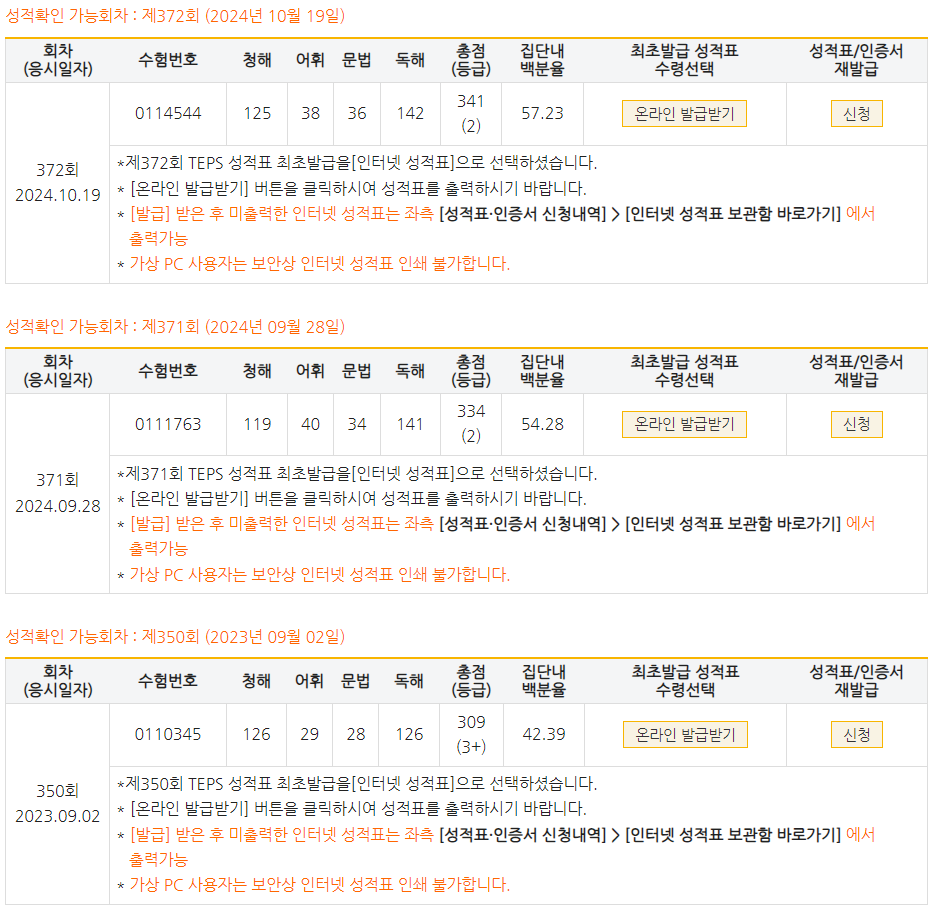 | 총점(600점) | 309점 | 341점 |