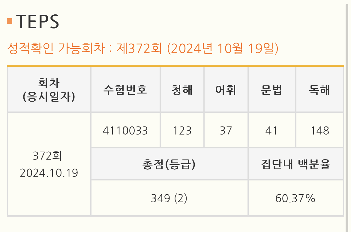 청해(240점) 어휘(60점) 문법(60점) 독해(240점) 총점(600점)