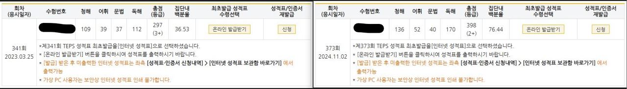 | 총점(600점) | 297점 | 398점 |