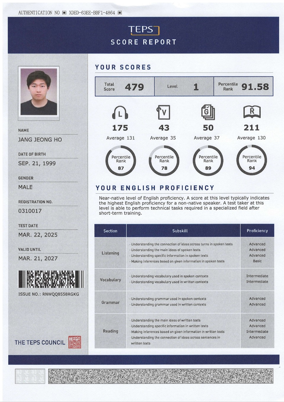 청해(240점) 어휘(60점) 문법(60점) 독해(240점) 총점(600점)