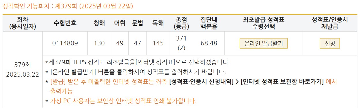 | 총점(600점) | 0점 | 371점 |