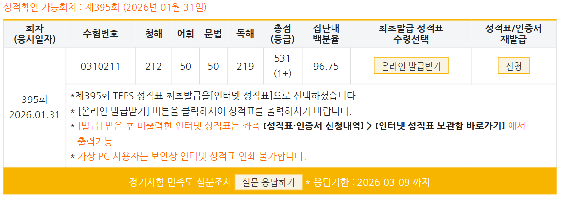 | 수강후 | 212점 | 50점 | 50점 | 219점 | 531점 |