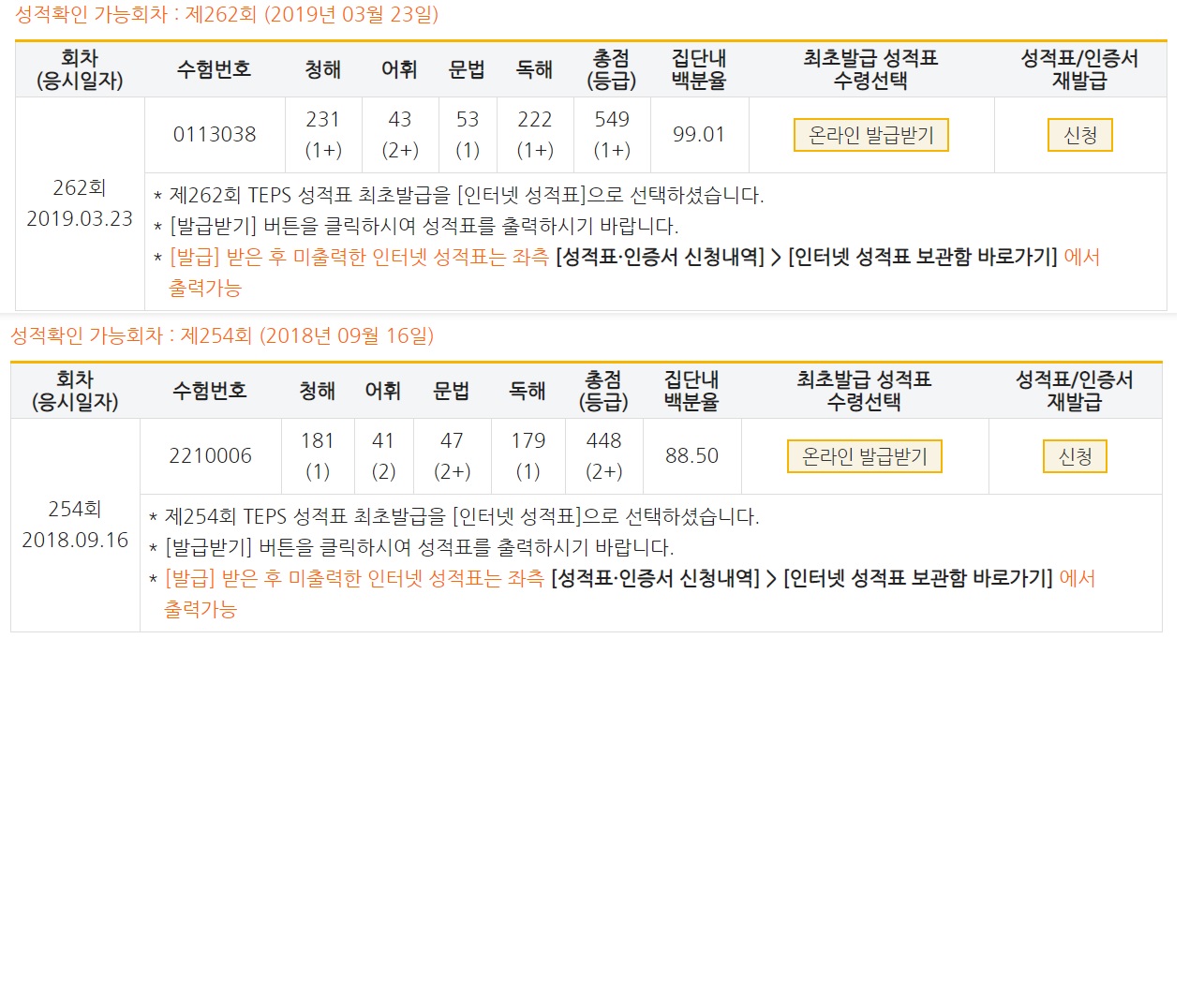 | 청해(396점) | 어휘(99점) | 문법(99점) | 독해(396점) | 총점(990점) | |