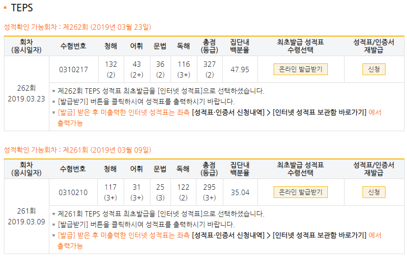 | 총점(600점) | 270점 | 327점 |