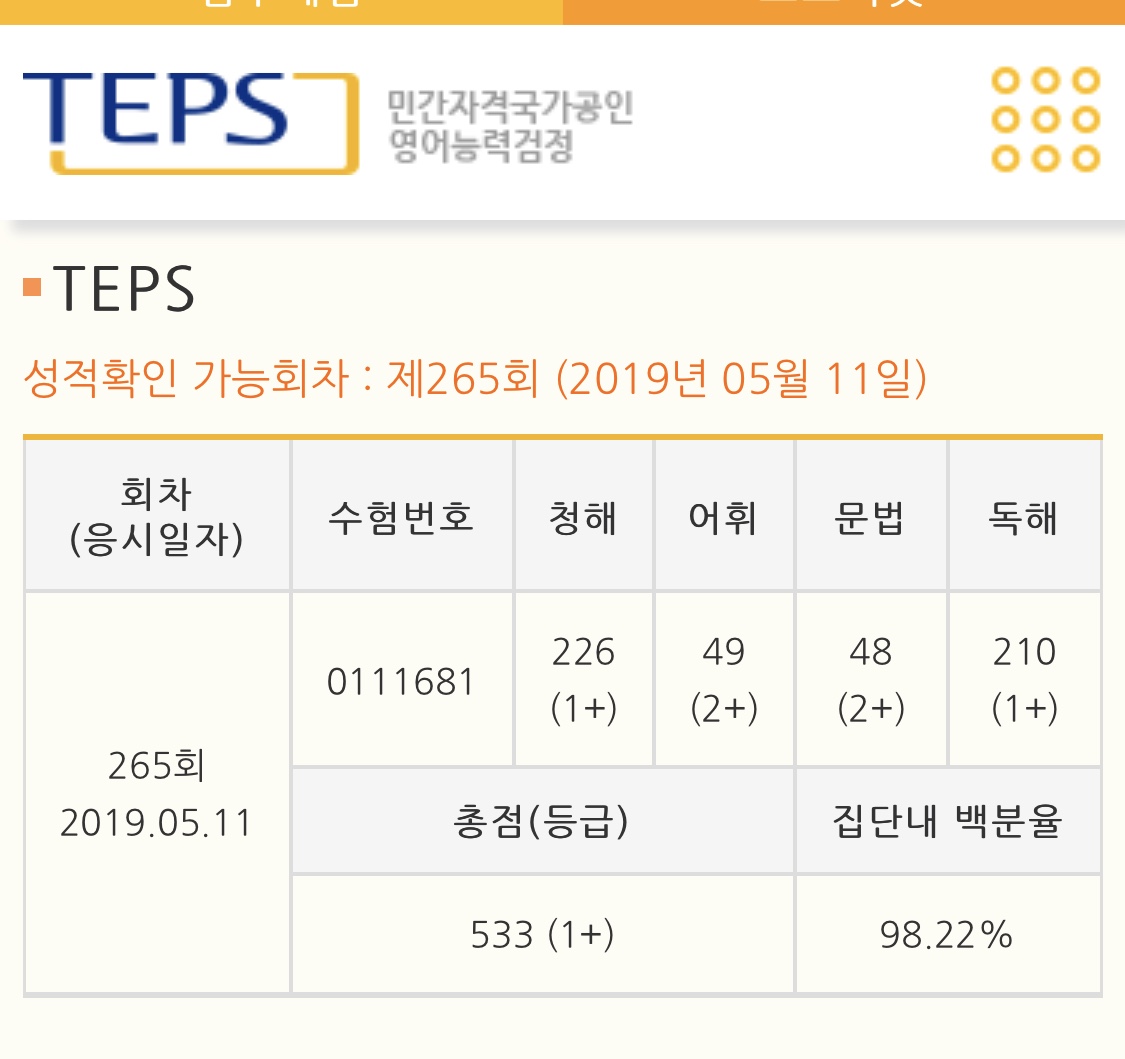 | 총점(600점) | 449점 | 533점 |