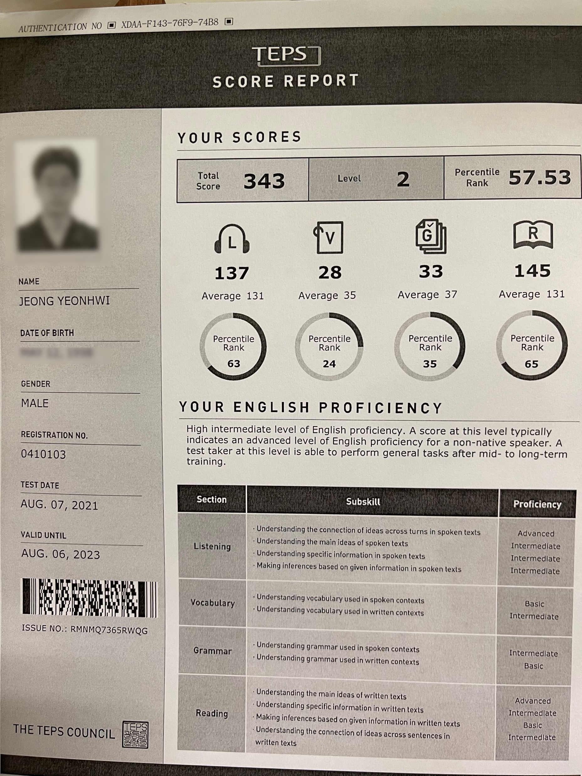 청해(240점) 어휘(60점) 문법(60점) 독해(240점) 총점(600점)