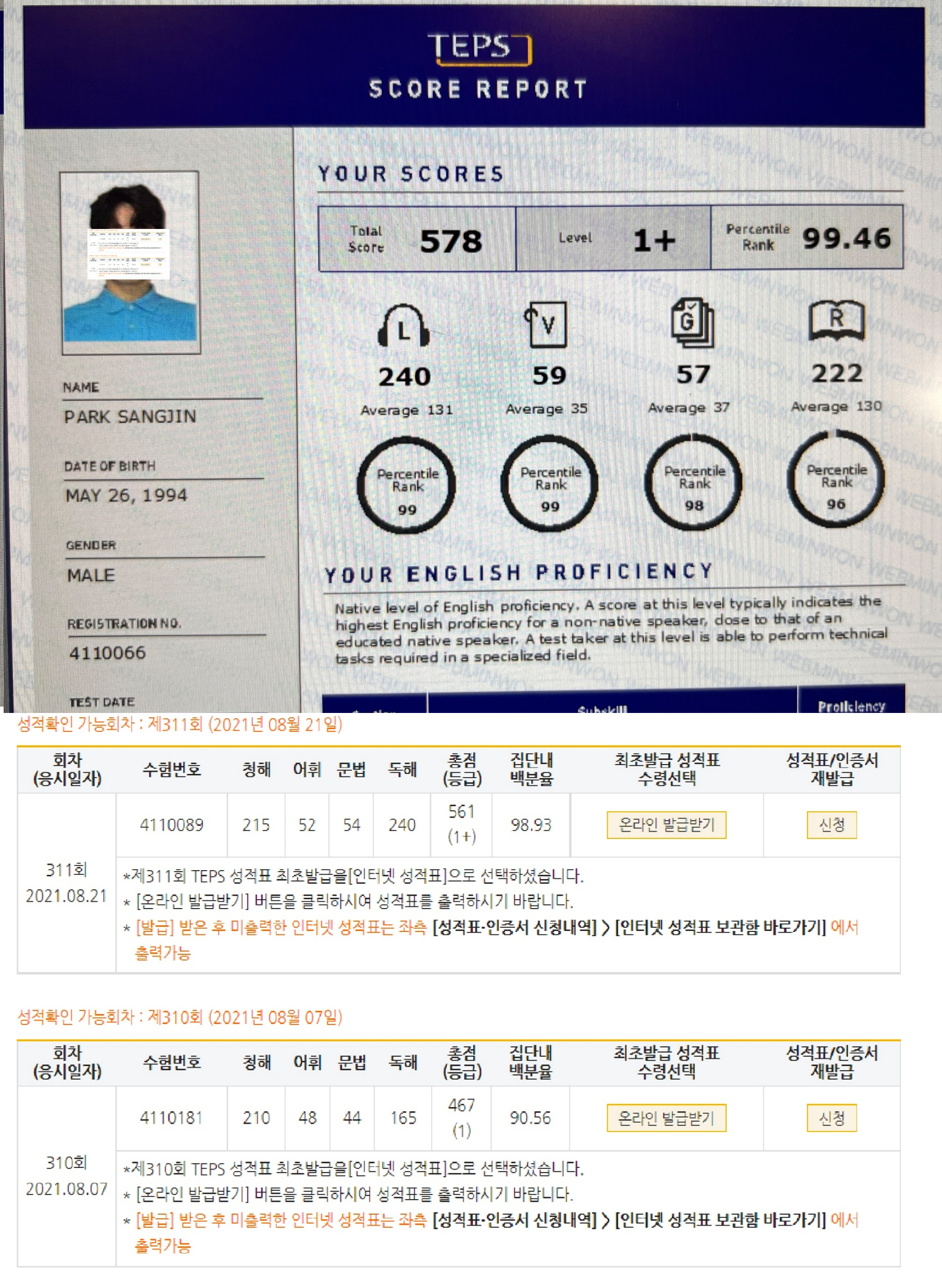| 수강후 | 240점 | 57점 | 59점 | 222점 | 578점 |