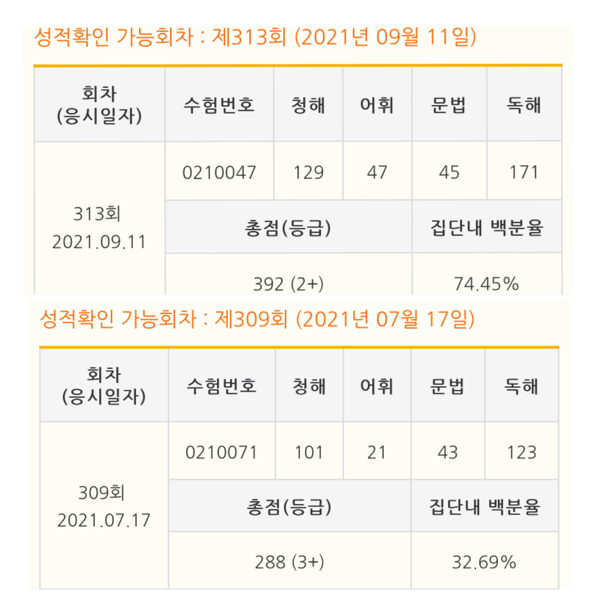 | 청해(240점) | 어휘(60점) | 문법(60점) | 독해(240점) | 총점(600점) | |