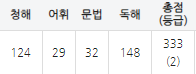청해(240점) 어휘(60점) 문법(60점) 독해(240점) 총점(600점)