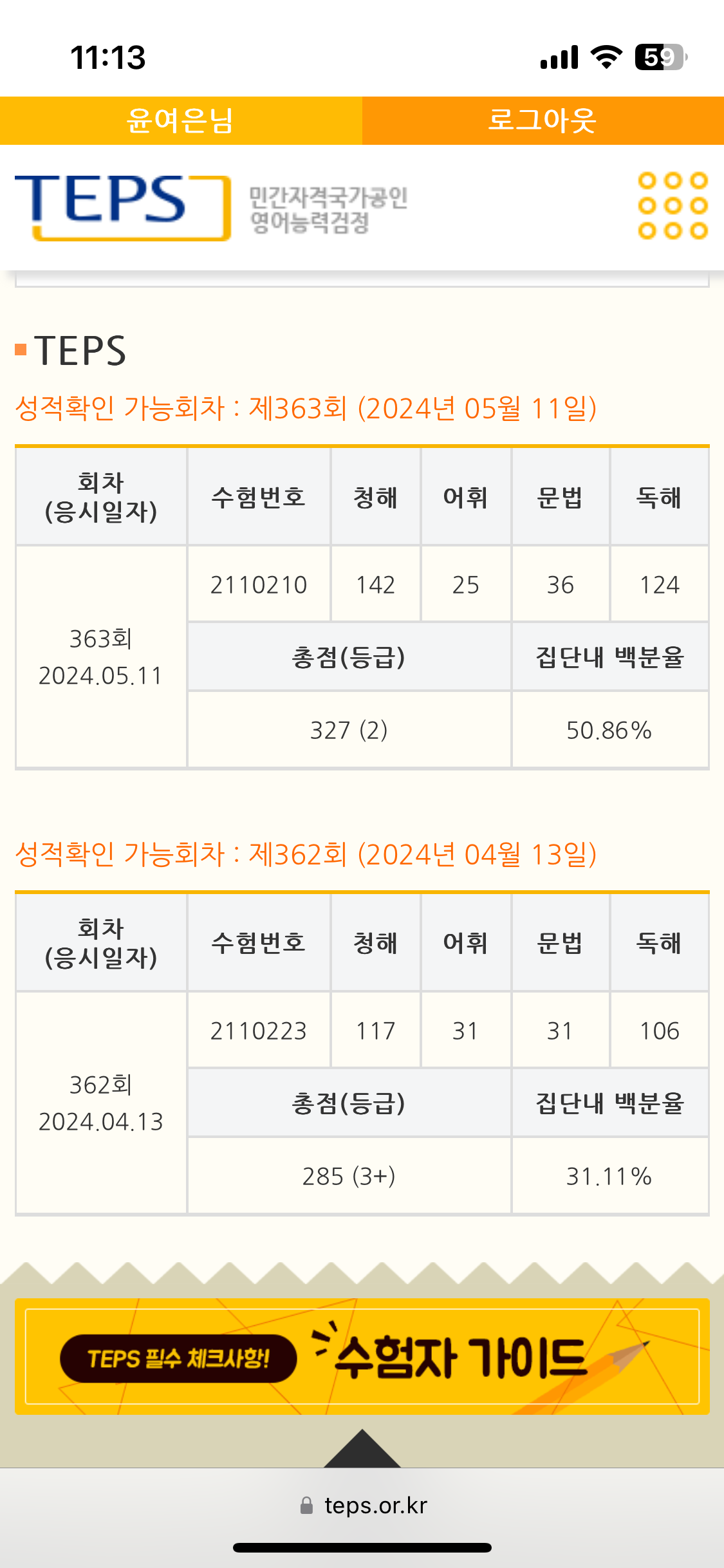 | 총점(600점) | 285점 | 327점 |
