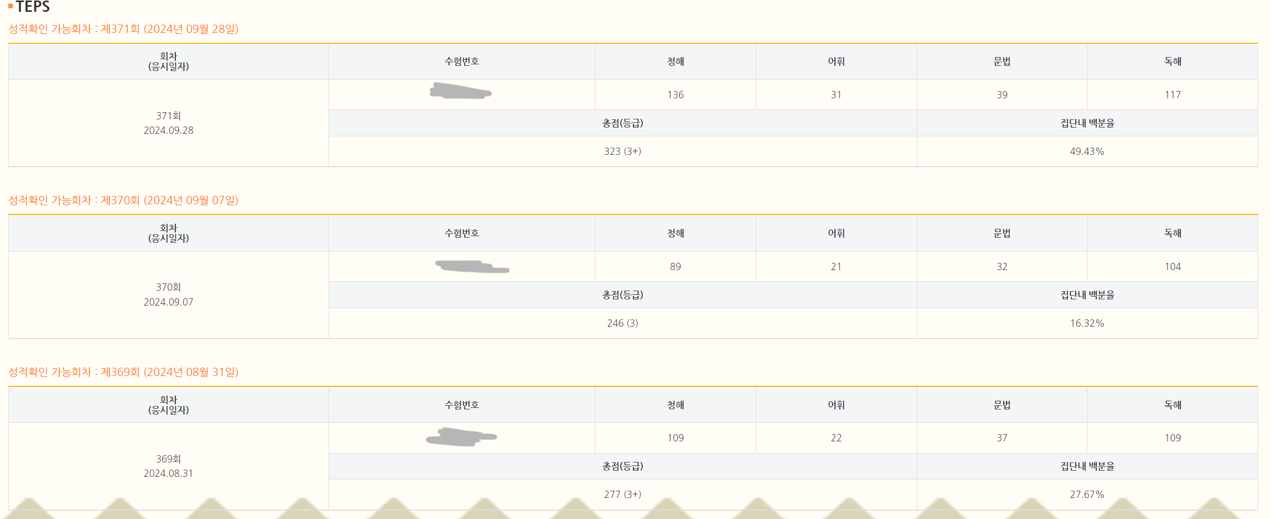 | 청해(240점) | 어휘(60점) | 문법(60점) | 독해(240점) | 총점(600점) | |