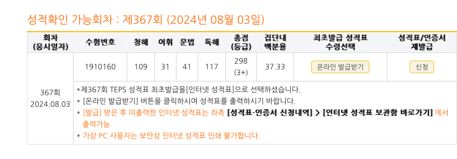 | 청해(240점) | 어휘(60점) | 문법(60점) | 독해(240점) | 총점(600점) | |