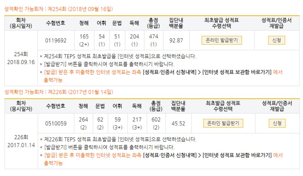 | 청해(396점) | 어휘(99점) | 문법(99점) | 독해(396점) | 총점(990점) | |